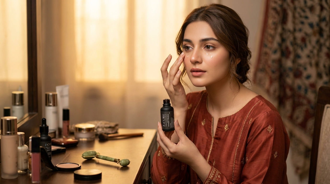 i-Cure Under Eye Serum is a dermatologically tested, advanced formula specifically designed to target dark circles, puffiness, and tired-looking under eyes. Enriched with a powerful blend of caffeine (10%), nicotinamide (2%), hyaluronate (2%), and squalene (2%), this lightweight serum deeply nourishes the delicate under-eye area, promoting a refreshed and revitalized appearance.